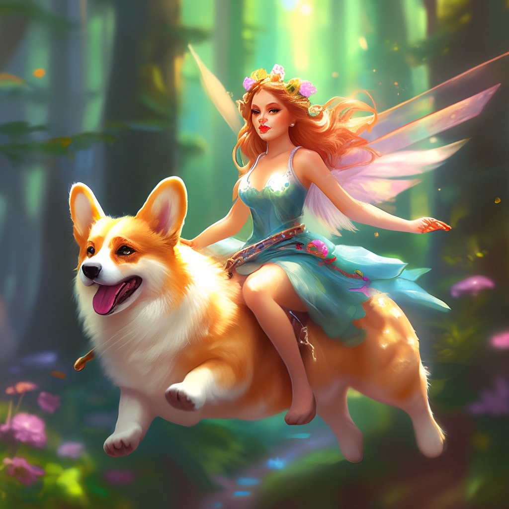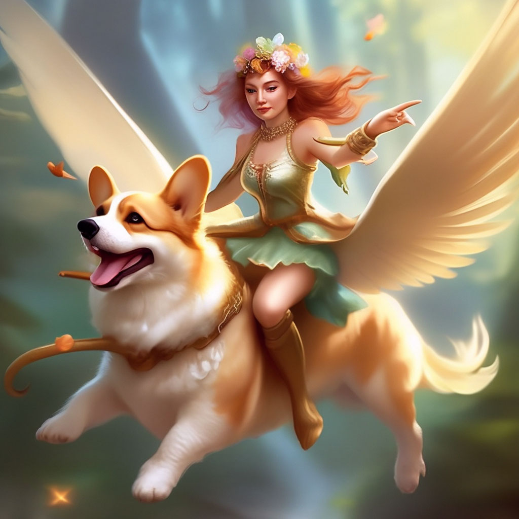 "Fairy riding a winged corgi" - image created in Shedevrum